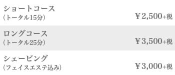 シェービングにフェイスエステでお顔を引き締め、シャンプー後にリラックスして頂くため肩のマッサージ、最後にスタイリングをさせていただきます。